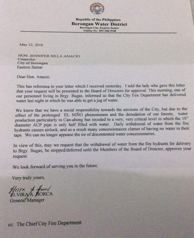Ini an naguinpaglaygay ni Borongan Water District General Manager Elvira A. Horca pinaagi hin usa nga surat nga naka-address kan City Councilor Jennifer Anacio.